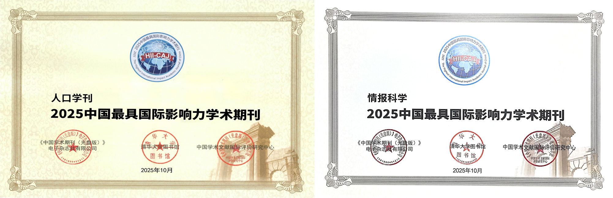 近日,中国知网和清华大学图书馆发布《中国学术期刊国际引证年报》(2025版),我校主办期刊《人口学刊》《情报科学》入选“2025中国最具国际影响力学术期刊(人文社会科学·中文)”。
