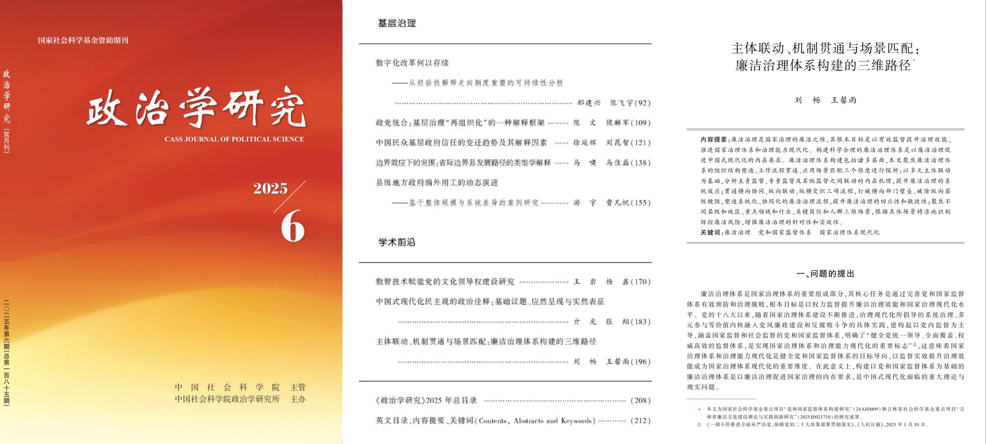 近日,我校行政学院刘畅教授博士研究生王馨雨研究成果《主体联动、机制贯通与场景匹配:廉洁治理体系构建的三维路径》在《政治学研究》2025年第6期发表。