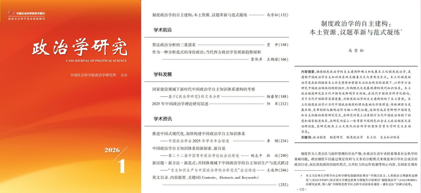 近日,吉林大学行政学院马雪松教授在《政治学研究》2026年第1期发表题为《制度政治学的自主建构:本土资源、议题革新与范式凝练》的文章。