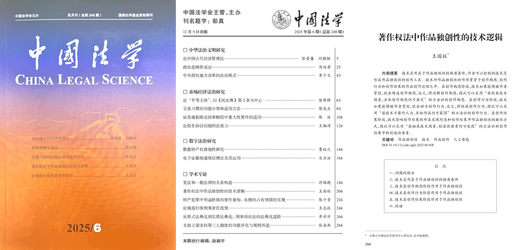 近日,我校法学院王国柱教授在《中国法学》2025年第6期发表题为《著作权法中作品独创性的技术逻辑》的文章。文章通过对作品创作进行全过程考察,探究技术在创作构思、创作行为和创作结果三个作品创作阶段作用于作品独创性的具体方式,体系化揭示作品独创性的技术逻辑。